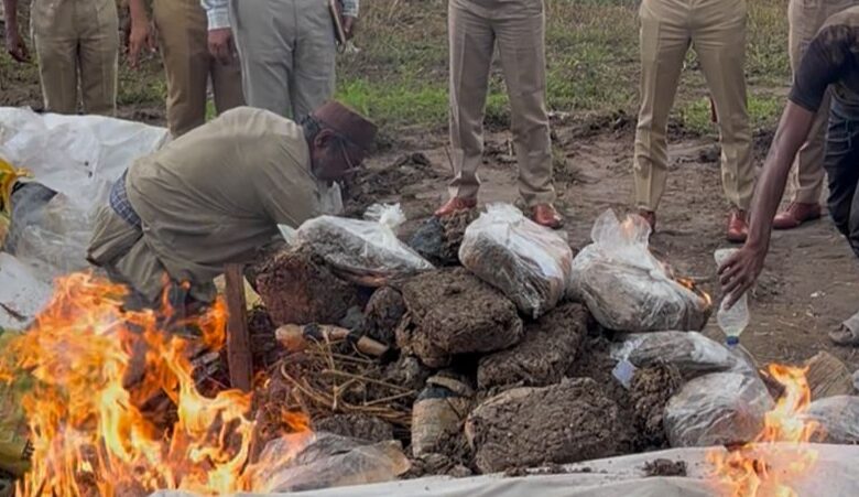 वेगवान मराठी प्रतिनिधी केशव डी मुंडे बीड जिल्हा पोलीस दलाच्या कार्यक्षम व तत्पर कारवाईत बीड जिल्हयातील ।। पोलीस स्टेशन अंतर्गत दाखल असलेल्या 14 वेगवेगळया गुन्हयामध्ये जप्त करण्यात आलेल्या एकूण 644.152 किलोग्रॅम गांजाचा नाश करण्यात आला आहे. हि कारवाई कोर्टाचे आदेशानुसार व अंमली पदार्थ टास्कफोर्स महाराष्ट्र राज्य यांच्या निर्देशानुसार मा. पोलीस अधिक्षक, बीड श्री नवनीत कांयत साहेब तथा अध्यक्ष डिस्पोजल कमिटी यांचे मार्गदर्शनाखाली सदर कार्यवाही बीड जिल्हयात दिनांक 29.09.2025 रोजी पार पाडण्यात आली आहे.